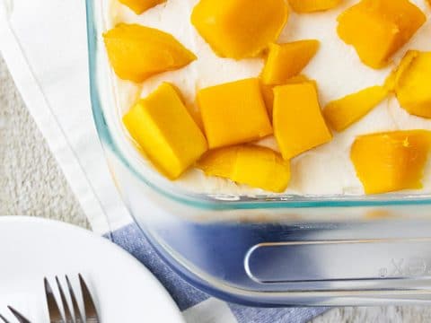 Mango graham cake is a popular dessert in the Philippines. Also called mango float, it’s cold, sweet and so easy to make. Just layer graham crackers, sweetened cream, mangoes and enjoy.