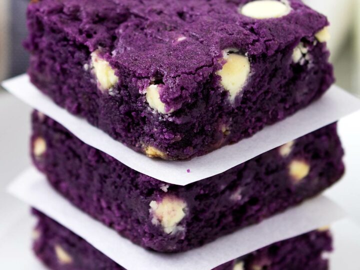 Ube brownies are your favourite chewy and fudgy brownies but packed with the ube flavour you love. Made with real ube halaya, sprinkled with white chocolate chips, so good.