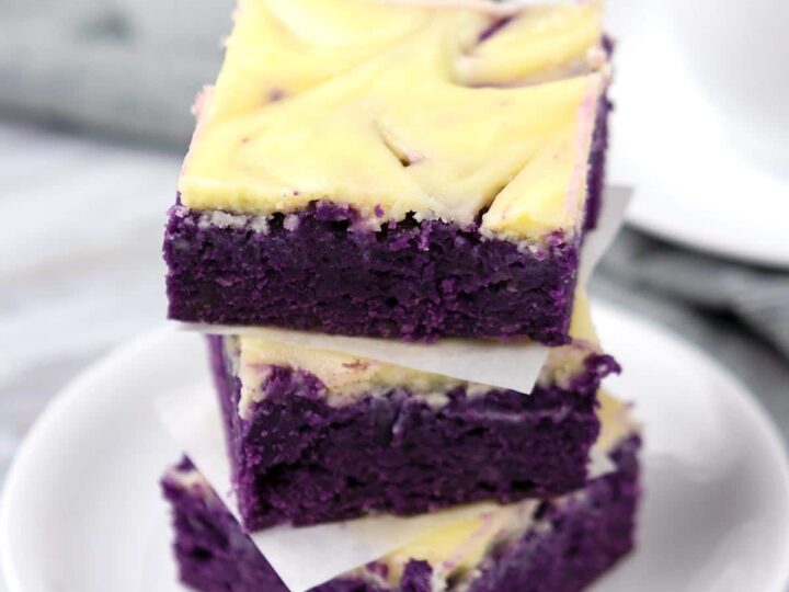 Ube cheesecake bars combine two of your favourite ube desserts — brownies and cheesecake! Creamy and tangy cream cheese swirls on top of chewy and fudgy ube brownies. So good.