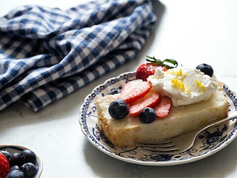 Angel food cake in a loaf pan is a delicate and fluffy white cake made from whipped egg whites and without cream of tartar. Serve it with fresh strawberries, blueberries, and whipped cream.