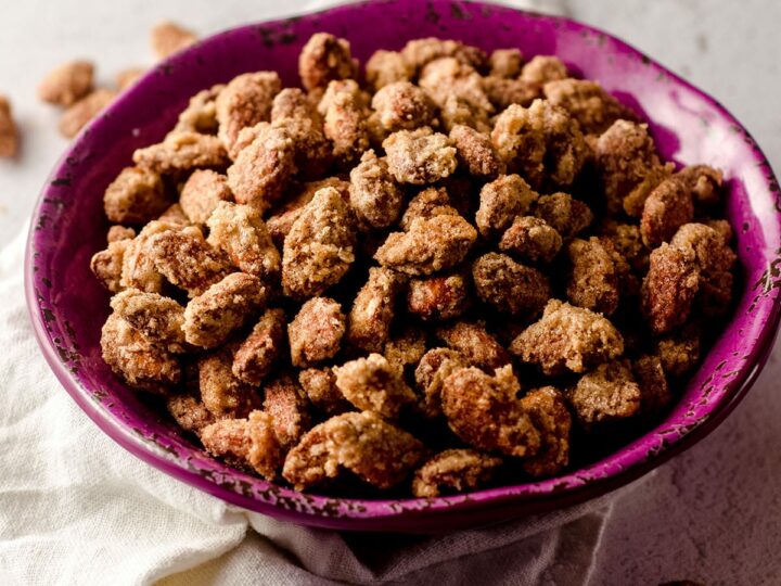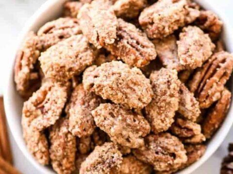 This homemade cinnamon sugar pecans recipe is easy to make with only 6 ingredients and is so much more delicious than the nuts from the mall or fair!