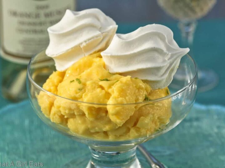 Meringue topped mango-pineapple sherbet is a tropical frozen dessert. It is easy to make and deliciously refreshing to eat!