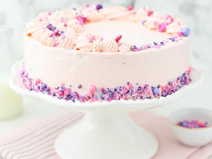 Fluffy soft white cake recipe with colourful sprinkles for a pop of fun. Perfect for birthdays and celebrations!