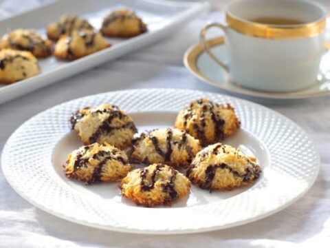 Kokosmakronen are a cross between a coconut macaroon and a meringue cookie. Soft and chewy on the inside and slightly crispy on the outside with a light and airy texture.