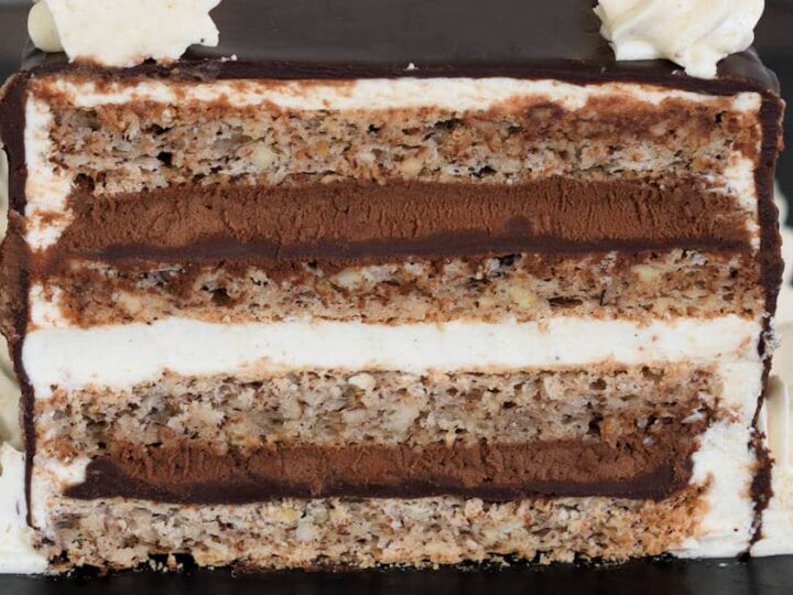 Beautiful layers of crispy and chewy meringue, decadent chocolate ganache and fluffy whipped hazelnut cream.