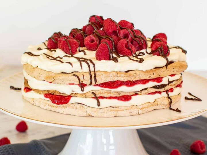 Three layers of hazelnut meringue are sandwiched with a filling of cream, chocolate and raspberries to create an elegant dessert for that special occasion!